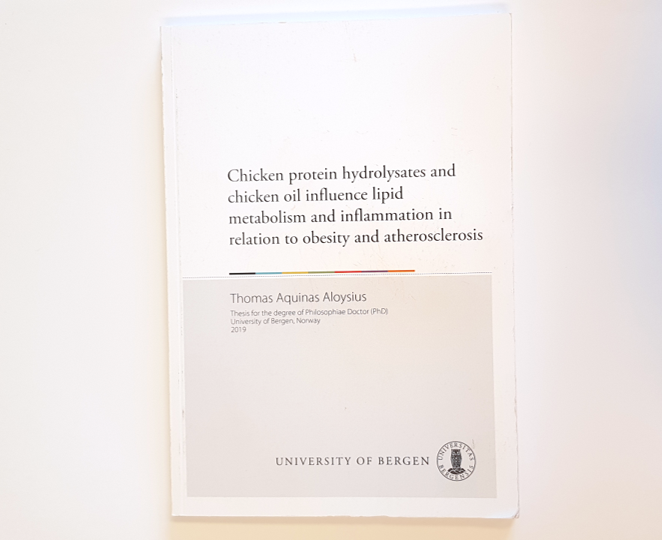 Thomas Aquinas Aloysius disputerte 13.09.2019 for PhD graden ved Universitetet i Bergen (UiB) på avhandlingen: Chicken protein hydrolysates and chicken oil influence lipid metabolism and inflammation in relation to obesity and atherosclerosis. Doktoranden er fra Jaffna på Sri Lanka. Han har Cand.scient. grad i molekylærbiologi fra UiB.